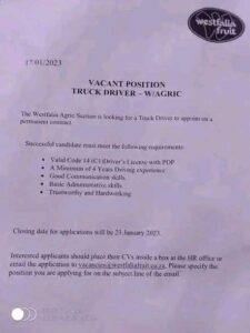 Interested applicants should place their CV inside a box at the HR office or email the application to vacancies@westfaliafruit.co.za