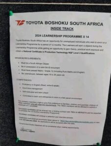 Send CV, ID copy, Matric/Grade 12 to TBSA.Recruitment@toyota-boshoko.com before 16 February 2024
