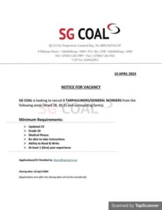 SG Coal Pty Ltd is looking to recruit candidates from Ward 28,30,31 and Surrounding Farms for the following vacancies: