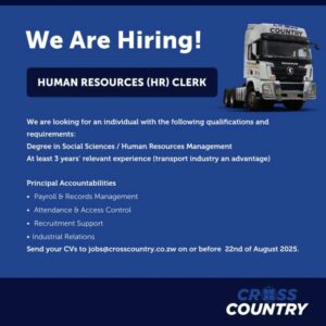 Email your CV and cover letter to jobs@crosscountry.co.zw