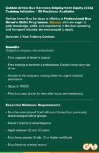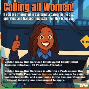 Golden Arrow Bus Services is offering a Professional Bus Driver’s Skills Programme for women applicants who are eager to gain knowledge, skills, and experience in the bus operating and transport.