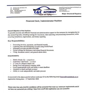 Email your CV to finance@ccautobody.co.za
